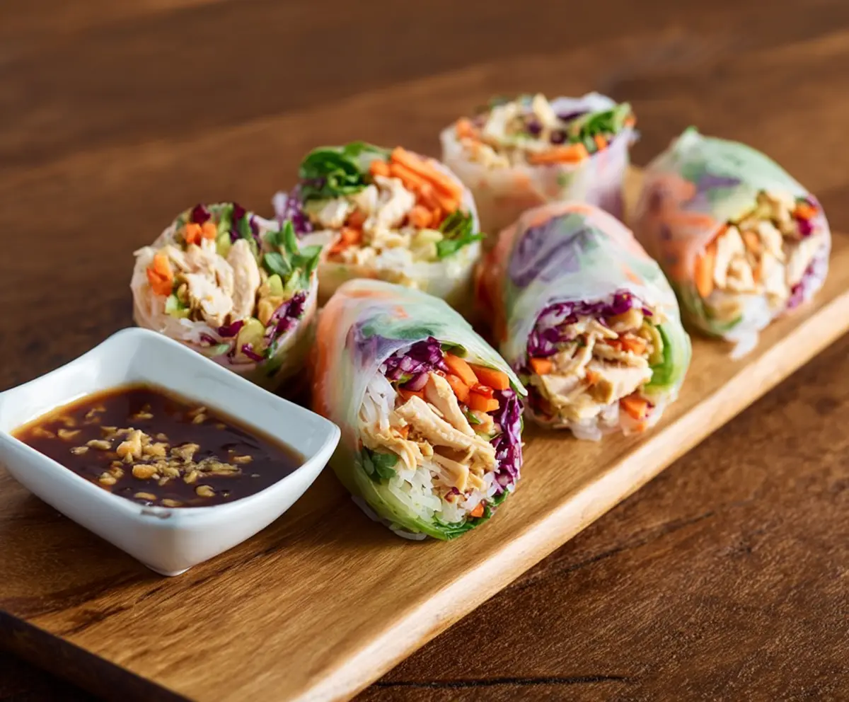 Delicious Teriyaki Chicken Rice Paper Rolls with fresh vegetables and sauce.