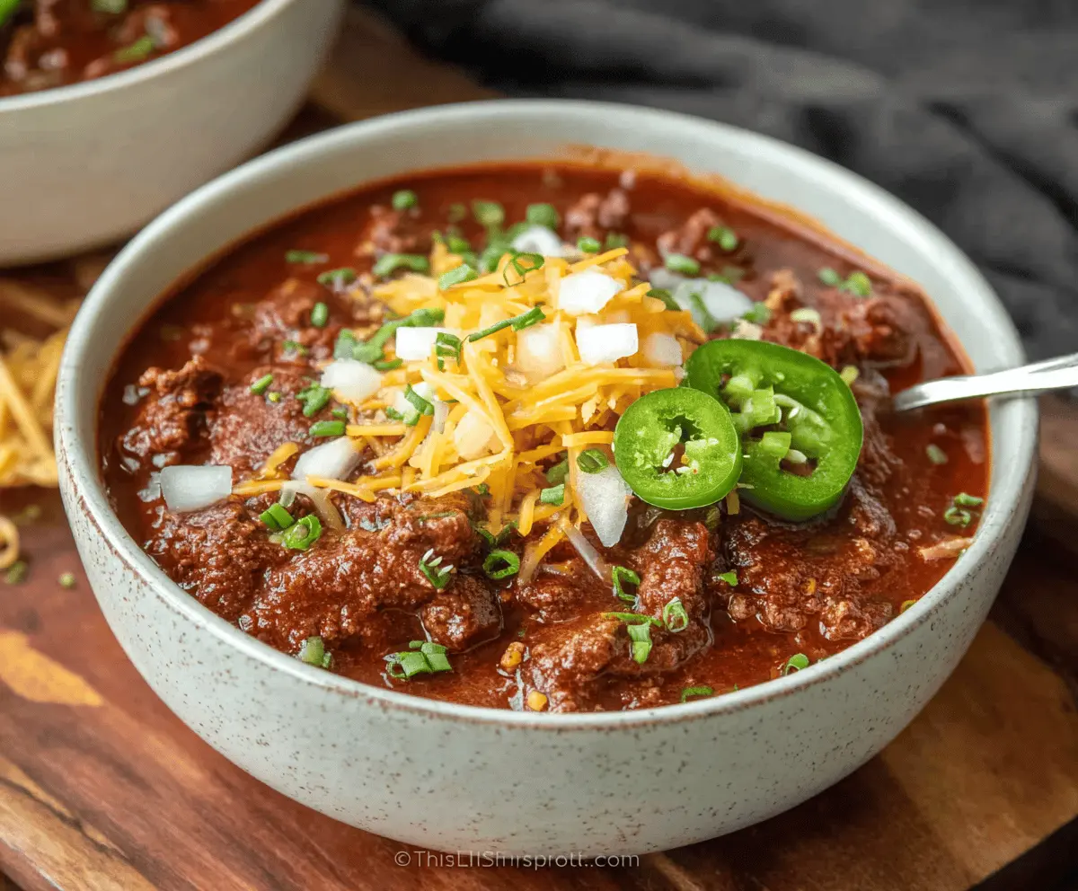 Texas Chili is a hearty and spicy dish that warms you right up! Made with tender beef, rich spices, and no beans, it packs a big flavor punch.